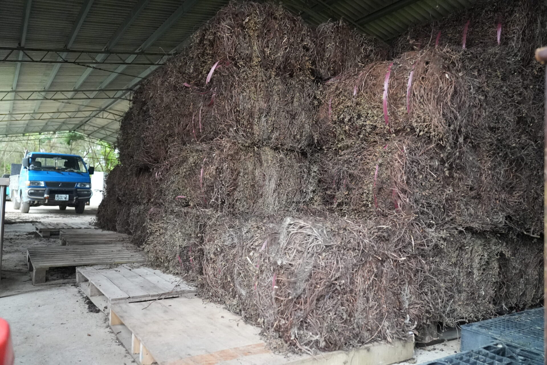 葉子有膠質、仙草枝幹有香氣| 一個人一天最多可以割一分地的仙草,通常需要請人幫忙,仙草收割從根部就要下刀,放在原地委凋,往年可以收120幾綑,堆滿棚間。中秋節採收,需曬半年,一直要到明年四五月,才能喝,也才開始賣。