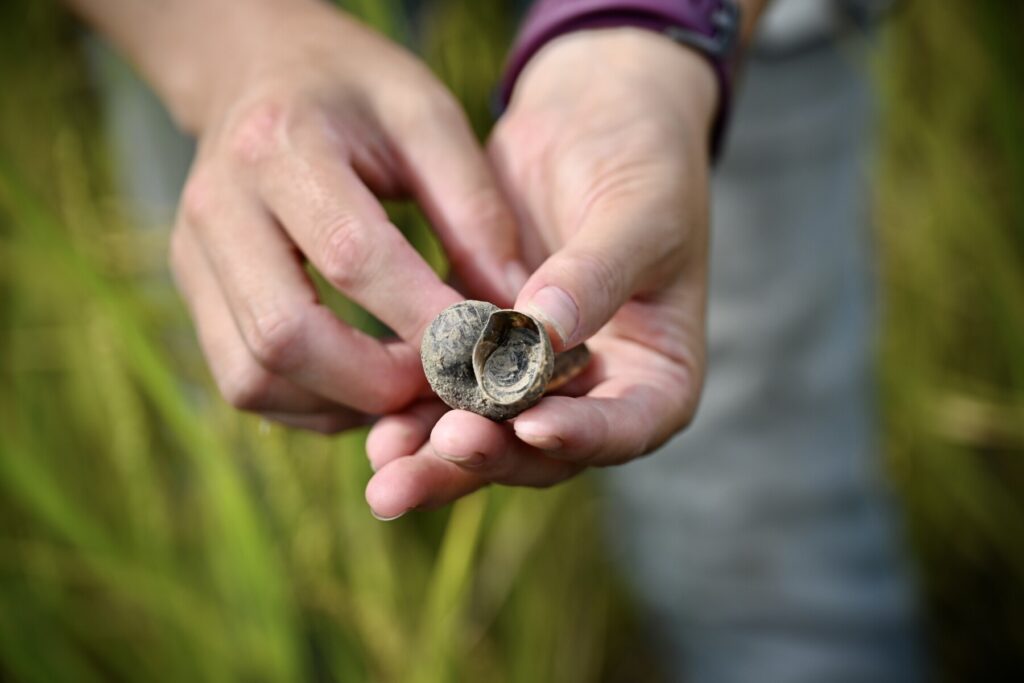 圖-「農田是一座自然博物館。」林芳儀和陳毅翰往田邊的溝圳一撈,溝渠裡的螺貝蜆蚌可是個熱鬧大家族,他們也透過自製標本箱,讓農事與生態觀測零距離。