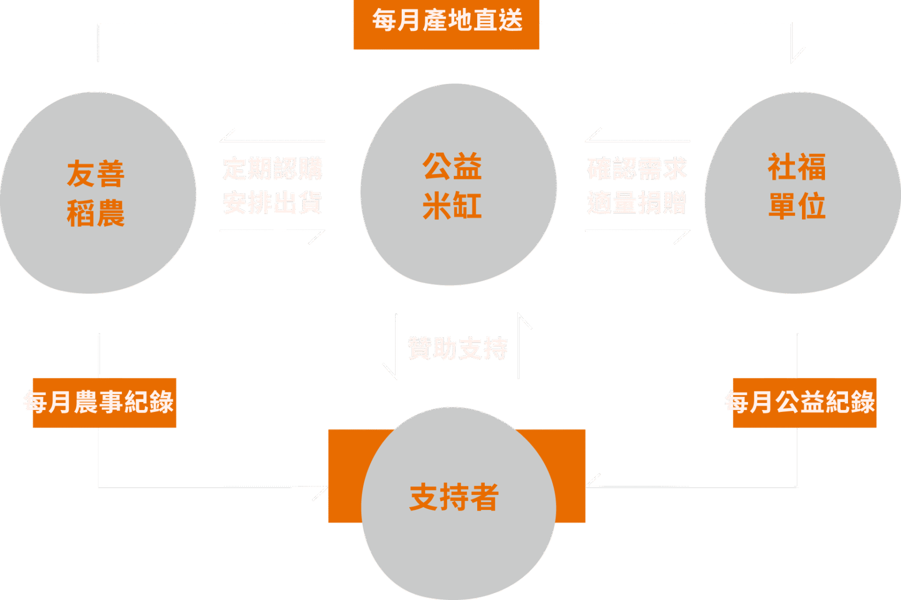 我們募集支持者的善意,穩定捐贈有機與友善耕作米給社福單位使用。一方面支持兼具生態永續的稻農,一方面協助社福單位減輕募糧壓力,幫助弱勢者不再擔憂溫飽。